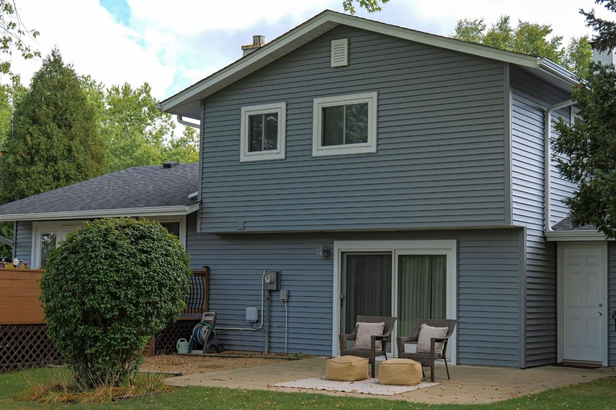 We also introduced a small but high‑impact accent move at the front elevation: vinyl shake at the gable and the bay that reads like wood from the curb. Between the horizontal siding and the shake, we added a clean frieze board to create a purposeful break line. Together, these details lift the façade, add depth, and make the home feel composed rather than busy.