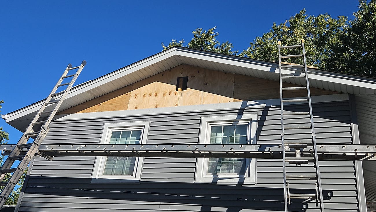 Installed housewrap/flashing → Deep Granite vinyl siding → LP SmartSide trims at windows/doors and both garage surrounds → new plywood at front peak (no charge) → shake at peak and bay → frieze board added.