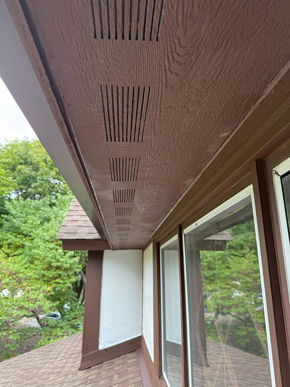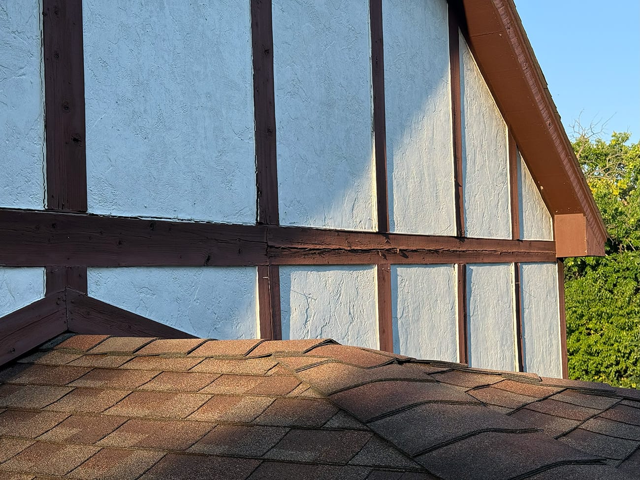 Services: Roof-edge protection and moisture control: bathroom venting, chimney housing and flashing, soffit and fascia upgrades, gutter system replacement, cedar repairs, and roof tune-ups on a two-story tudor.