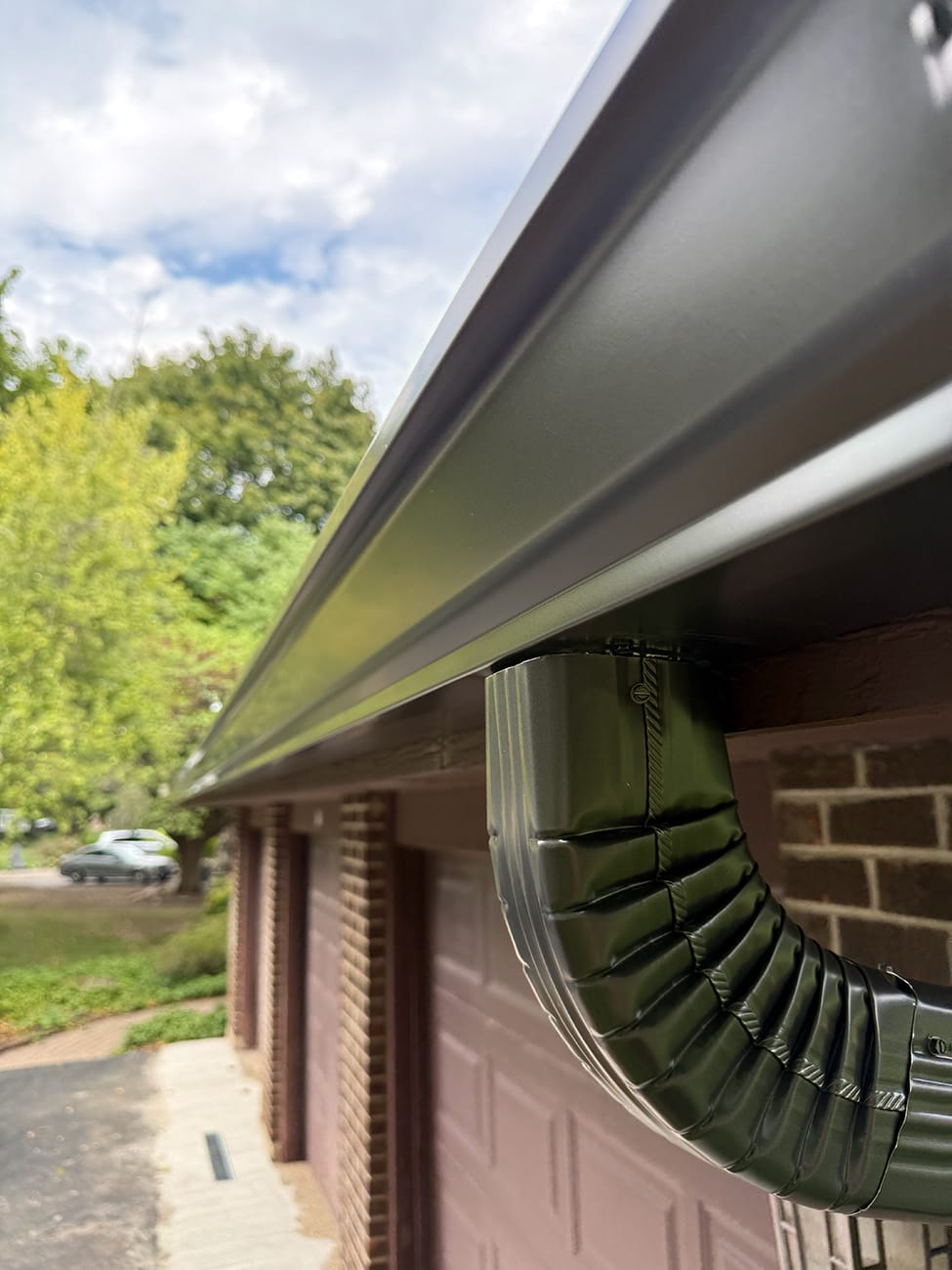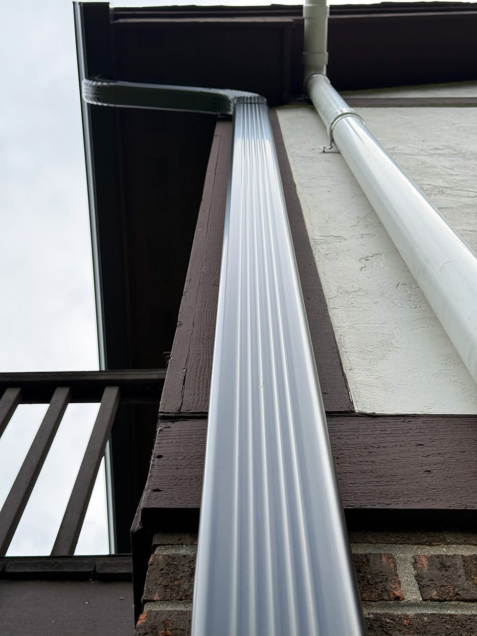 Installed 6" seamless gutters with 3"×4" oversized downspouts, including proper pitch, outlets, and secure fastening.